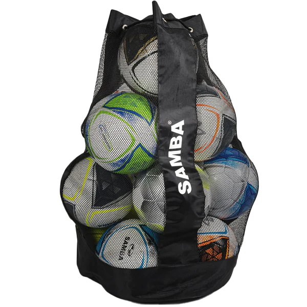 Samba mesh ball sack, print friendly polyester with mesh panels. Draw-cord closure and shoulder strap.