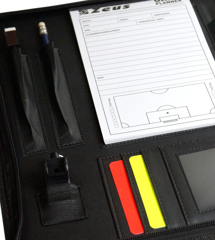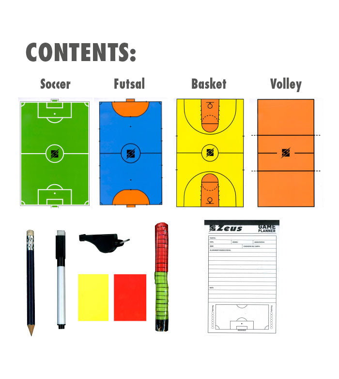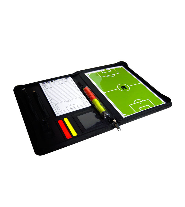 The coach board is a tactical clipboard designed for coaches of football, futsal, basketball, and volleyball. Made from 100% eco-leather, it measures 25 x 35 cm and includes a marker, magnets, and game templates for various sports.